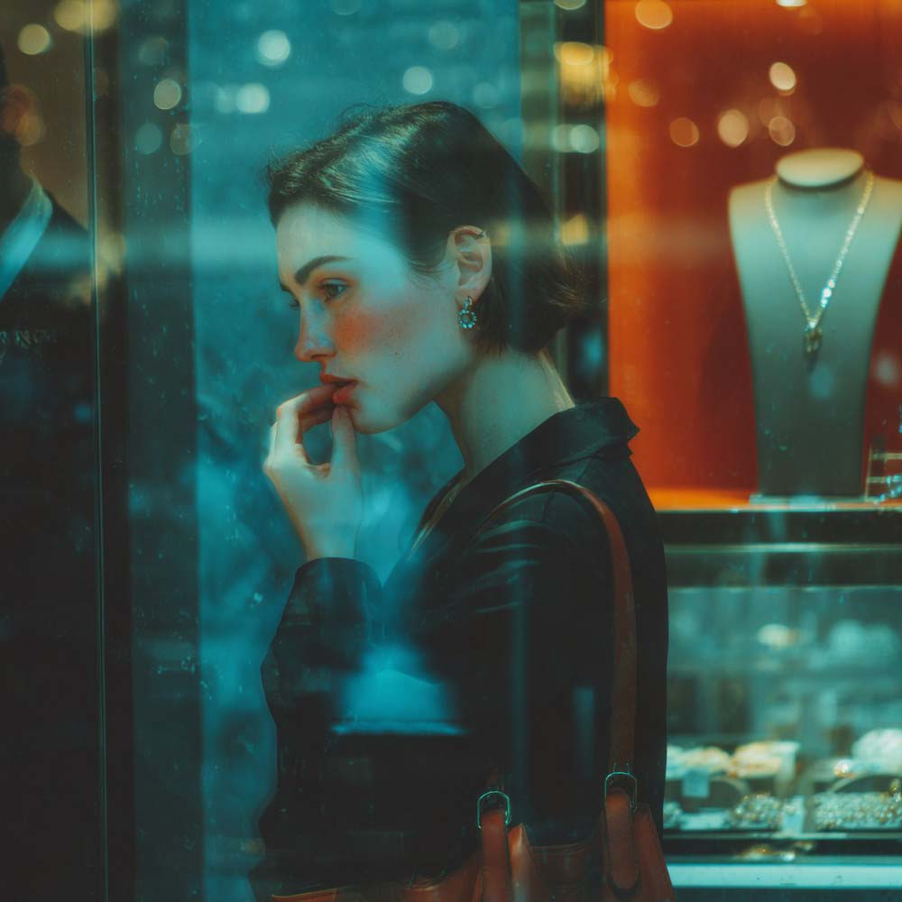 Bewundernd betrachtet sie einen Kettenanhänger in einem Schaufenster, der eine gefesselte Frau darstellt. Sie ahnt zu diesem Zeitpunkt nicht, was ihr die Post noch am selben Tag ins Haus bringen wird.